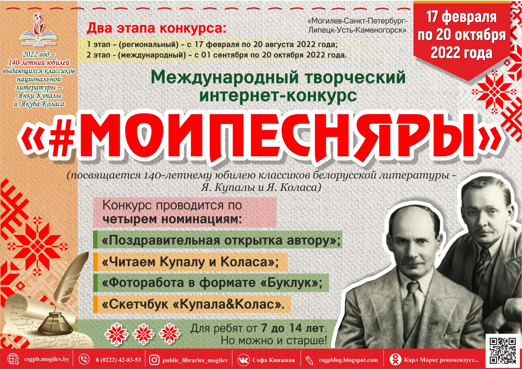 Читатели нашей библиотеки стали участниками стартапа Международного творческого интернет-конкурса «#МОИПЕСНЯРЫ», посвященного 140-летнему юбилею классиков белорусской литературы – Я. Купалы и Я. Коласа, который состоялся в онлайн-формате. Организатором конкурса выступила «Централизованная система государственных публичных библиотек г. Могилева». Кроме нашей библиотеки в мероприятии приняли участие коллеги и читатели ЦБС г. Липецка, МЦБС им. М.Ю. Лермонтова г. Санкт-Петербурга….